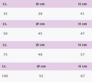 Dimensioni: 35 Lt: Ø39x41cm, 50 Lt: Ø45x47cm, 75 Lt: Ø48x57cm, 100 Lt: Ø52x67cm