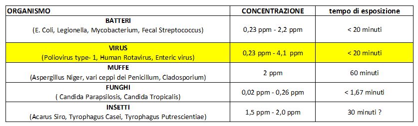 Il comitato per la sicurezza alimentare ha pubblicato, il 27/10/2010 questa tabella che indica le concentrazioni ed i tempi di esposizioni necessari ad abbattere diversi organismi: