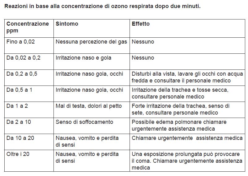 Nella seguente tabella invece, si possono visionare, a seconda della concentrazione di ozono presente, i sintomi sugli umani dopo 2 minuti di esposizione.